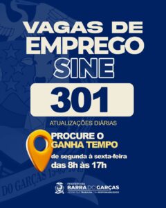 As vagas de emprego ofertadas pelo Sine são atualizadas diariamente e também podem ser consultadas no site da Prefeitura Municipal de Barra do Garças, clique aqui: https://www.barradogarcas.mt.gov.br/Sine-Barra-do-Garcas/.