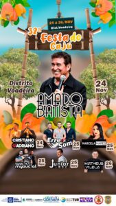 De 24 a 26 de novembro, o Distrito de Voadeira será palco de diversão e tradição. A abertura será incrível com o show nacional de Amado Batista, Erre Som com o melhor do lambadão no Sábado e muitas atrações regionais. Venha viver esse momento único conosco.