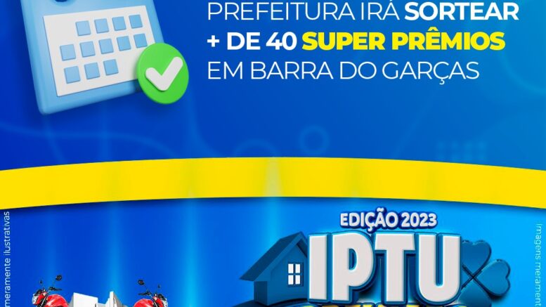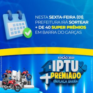 A Prefeitura de Barra do Garças sorteará mais de 40 super prêmios, incluindo três motos zero quilômetro, através da campanha “IPTU Premiado e Emplaca Barra”, no dia 1º de dezembro, nesta sexta-feira. O prazo para retirar os cupons e participar do sorteio de prêmios foi encerrado no dia 27, última segunda-feira.
