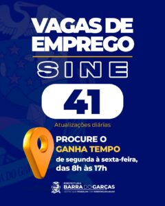 O Sistema Nacional de Emprego (Sine) de Barra do Garças, divulgou nesta segunda-feira (18), 41 novas vagas de trabalho, em diferentes áreas, como: Recepcionista de hotel, Auxiliar de cozinha, Auxiliar financeiro e outros.