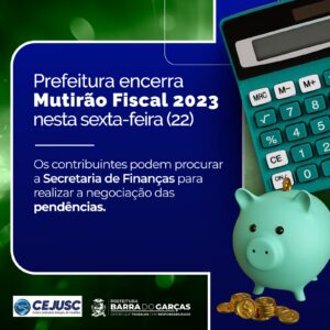 A Prefeitura de Barra do Garças, em parceria com o Tribunal de Justiça do Estado de Mato Grosso, encerra nesta sexta-feira (22) os atendimentos do Mutirão Fiscal 2023, o programa visa a regularização da situação fiscal de moradores, que por algum motivo, estão em atraso com o pagamentos de tributos municipais.