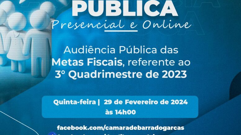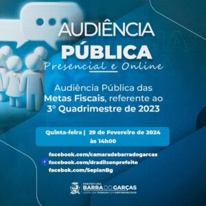 A Prefeitura de Barra do Garças, por meio da Secretaria Municipal de Planejamento, realizará uma Audiência Pública de Demonstração e Avaliação do Cumprimento de Metas Fiscais, referente ao 3° Quadrimestre de 2023, na presença da Comissão de Economia e Finanças da Câmara Municipal. A Audiência será realizada às 14h, no dia 29 de fevereiro, na Câmara Municipal.