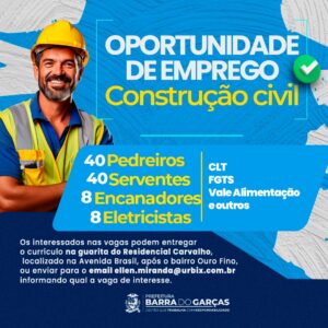 Com as obras no Residencial Carvalho avançando a todo vapor, diversas oportunidades de trabalho vão surgindo no local e, nesta quarta-feira (21), a ServMix divulgou mais 96 vagas de trabalho disponíveis para início imediato. As vagas são para: Pedreiro (40); Servente de pedreiro (40); Encanador (8) e Eletricista (8).