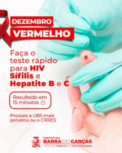 A Prefeitura de Barra do Garças, por meio da Secretaria Municipal de Saúde, está chamando a população para realizar o teste rápido de infecções sexualmente transmissíveis (IST’s), em alusão à campanha Dezembro Vermelho. O exame leva poucos minutos para ser realizado e pode ser procurado ao longo de todo o ano nas Unidades Básicas de Saúde (UBS) do município e no Centro de Testagem e Acolhimento (CTA).