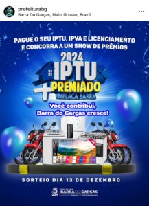A Prefeitura de Barra do Garças reforça aos contribuintes que a retirada de cupons para participar do sorteio de prêmios da campanha “IPTU Premiado e Emplaca Barra 2024” encerra nesta quinta-feira (12). Os cupons devem ser retirados na Gerência de Arrecadação ou no posto de atendimento da Secretaria de Finanças, no Ganha Tempo, até às 17h.