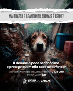 O ato de abandonar ou realizar qualquer tipo de abuso e maus-tratos a animais domésticos é considerado crime ambiental, punido com prisão e multa. O alerta é da Prefeitura de Barra do Garças, por meio da Secretaria Municipal de Meio Ambiente e Sustentabilidade, que disponibiliza um canal de denúncias para casos de maus-tratos a animais domésticos.