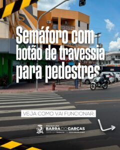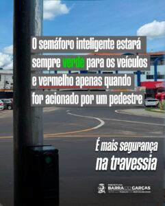 Com o intuito de garantir mais fluidez do trânsito na av. Ministro João Alberto, a Prefeitura de Barra do Garças iniciou a instalação do semáforo inteligente com botão de travessia para pedestres na esquina do supermercado Mendonça, próximo a praça dos Garimpeiros. O novo equipamento será ativado em breve.