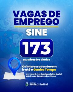 As vagas de emprego ofertadas pelo Sine são atualizadas diariamente e podem ser consultadas no site oficial da Prefeitura de Barra do Garças.