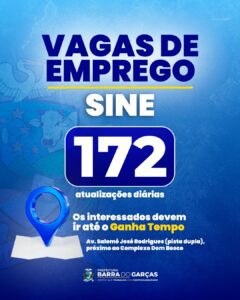 As vagas de emprego ofertadas pelo Sine são atualizadas diariamente e podem ser consultadas no site oficial da Prefeitura de Barra do Garças.