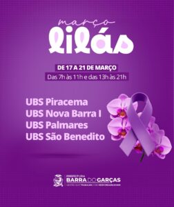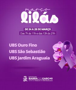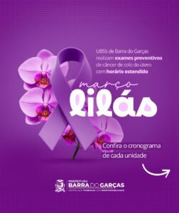 Em referência à campanha “Março Lilás”, promovida anualmente em prol da conscientização e prevenção do câncer de colo do útero, ao longo deste mês, as Unidades Básicas de Saúde (UBS’s) de Barra do Garças atenderão com horário estendido, até as 21h, para a realização de exames preventivos. As ações serão iniciadas na próxima segunda-feira (10).