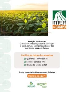 O Instituto Mato-grossense de Economia Agropecuária (Imea), em parceria com a Associação dos Produtores de Soja e Milho de Mato Grosso (Aprosoja-MT) e o Instituto Mato-grossense do Agronegócio (Iagro), promove uma nova edição do “Imea em Campo”.