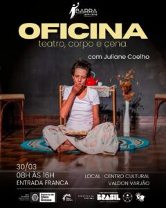 A oficina “Teatro, Corpo e Cena” será realizada no dia 30 de março e abordará diversos aspectos da presença e da performance do ator em cena. As inscrições podem ser feitas aqui.
