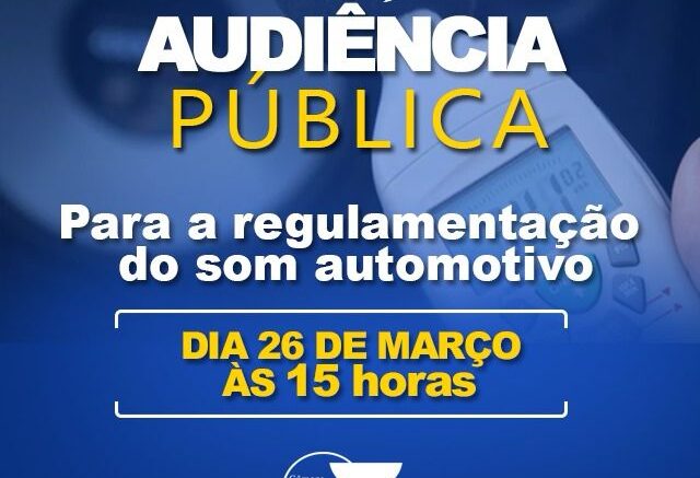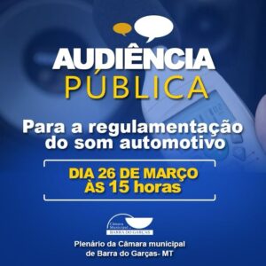A Câmara Municipal de Barra do Garças convida toda a população para participar da Audiência Pública sobre a Regulamentação do Som Automotivo, que será realizada no dia 26 de março de 2025, às 15h, no Plenário da Câmara.