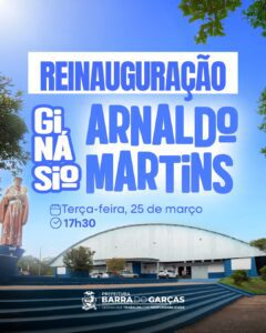 A Prefeitura de Barra do Garças, através da Secretaria de Educação, Esporte e Lazer tem a honra de convidar toda a comunidade barra-garcense para prestigiar a reinauguração do Ginásio de Esportes Arnaldo Martins. O evento acontecerá nesta terça-feira (25), às 17h30.