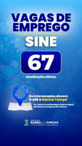 As vagas de emprego ofertadas pelo Sine são atualizadas diariamente e podem ser consultadas no site oficial da Prefeitura de Barra do Garças.