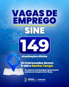 As vagas de emprego ofertadas pelo Sine são atualizadas diariamente e podem ser consultadas no site oficial da Prefeitura de Barra do Garças.