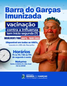 Na próxima segunda-feira (7), a Prefeitura de Barra do Garças dará início à vacinação contra a Influenza (gripe) no município e as doses estarão disponíveis em todas as Unidades Básicas de Saúde (UBSs), com exceção da UBS do Recanto das Acácias. A campanha se estenderá até 31 de maio e o imunizante também será disponibilizado nas unidades de saúde rurais.