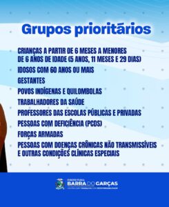 Conforme determinação do Ministério da Saúde, inicialmente, a vacina será ofertada aos grupos prioritários, que incluem: crianças a partir de 6 meses a menores de 6 anos de idade (5 anos, 11 meses e 29 dias), idosos com 60 anos ou mais, gestantes, povos indígenas, quilombolas, trabalhadores da saúde, professores das escolas públicas e privadas, Pessoas com Deficiência (PCDs), Forças Armadas.