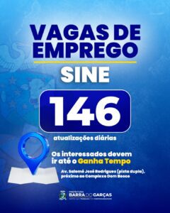 As vagas de emprego ofertadas pelo Sine são atualizadas diariamente e podem ser consultadas no site oficial da Prefeitura de Barra do Garças.