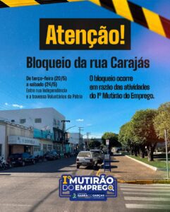 A Prefeitura de Barra do Garças informa que entre terça-feira (20) e sábado (24), um trecho da rua Carajás será bloqueado para a realização das atividades do Mutirão do Emprego, que ocorrem essa semana. O evento acontece de quarta (21) a sexta-feira (23), com oferta de vagas de emprego, cursos profissionalizantes, serviços de saúde e beleza, e emissão de documentos.