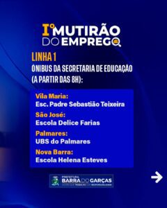 O ônibus da Educação continua com seu itinerário sendo iniciado a partir das 8h e atende os bairros Vila Maria, (com ponto na Escola Padre Sebastião Teixeira), São José (Escola Delice Farias), Palmares (UBS) e Nova Barra (Escola Helena Esteves);
