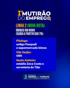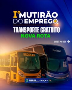 A Prefeitura de Barra do Garças informou uma alteração no itinerário do ônibus da empresa Rio Novo, que fará o transporte gratuito de moradores para o 1º Mutirão do Emprego, que está acontecendo entre os dias 21 a 23 de maio no estacionamento da Prefeitura Municipal.