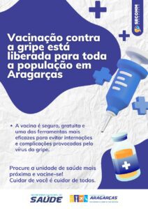 A Prefeitura de Aragarças, por meio da Secretaria Municipal de Saúde e da Coordenação de Vigilância Epidemiológica, informa que a vacina contra a gripe (Influenza, incluindo o subtipo H1N1) agora está disponível para toda a população, e não apenas para os grupos prioritários.