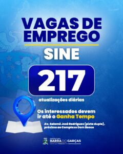 As vagas de emprego ofertadas pelo Sine são atualizadas diariamente e podem ser consultadas no site oficial da Prefeitura de Barra do Garças.