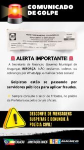 A Prefeitura Municipal de Aragarças – GO (distante 375 km de Goiânia), emitiu um importante alerta à população diante de golpes que vêm sendo registrados em diversos municípios do país, onde criminosos se passam por servidores públicos para cobrar tributos municipais por meios digitais. Os estelionatários enviam mensagens via WhatsApp, e-mail ou outros aplicativos, solicitando pagamentos de impostos como IPTU, ITBI, ISSQN, taxas de alvará e outras obrigações fiscais.