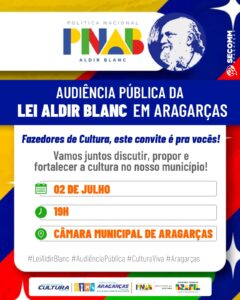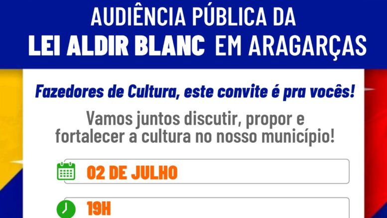A Prefeitura de Aragarças, por meio da Secretaria de Educação e Cultura, convida todos os artistas, agentes culturais, produtores e demais envolvidos com a cultura local para participarem da Audiência Pública sobre a Lei Aldir Blanc.