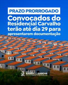 Foi prorrogado o prazo de montagem dos dossiês dos convocados na primeira etapa de análise do Residencial Carvalho. Os nomes que constam na lista terão até o dia 29 de agosto para entregar a documentação exigida, processo que definirá a compatibilidade no Programa Minha Casa Minha Vida.