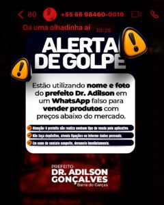 A assessoria do prefeito de Barra do Garças, Dr. Adilson Gonçalves, informa que está circulando um perfil falso no WhatsApp se passando pelo gestor municipal. Os golpistas estão utilizando o nome e a foto do prefeito para enganar a população, solicitando vantagens financeiras.