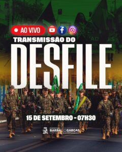 A Prefeitura de Barra do Garças vai transmitir ao vivo, pelas redes sociais oficiais, o tradicional desfile cívico-militar em comemoração ao aniversário de 77 anos da cidade. O evento acontece na próxima segunda-feira, 15 de setembro, a partir das 7h, na Avenida Ministro João Alberto.