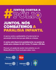 A Confederação Brasileira de Futebol (CBF) e o Rotary anunciaram mais uma rodada da parceria para reforçar a campanha “Juntos contra a Pólio”. Durante o mês de outubro, em sintonia com o Dia Mundial de Combate à Pólio (24/10), o slogan da campanha entrará em campo através das placas de LED, como mensagem especial de conscientização, lembrando ao mundo que a poliomielite ainda não foi erradicada.