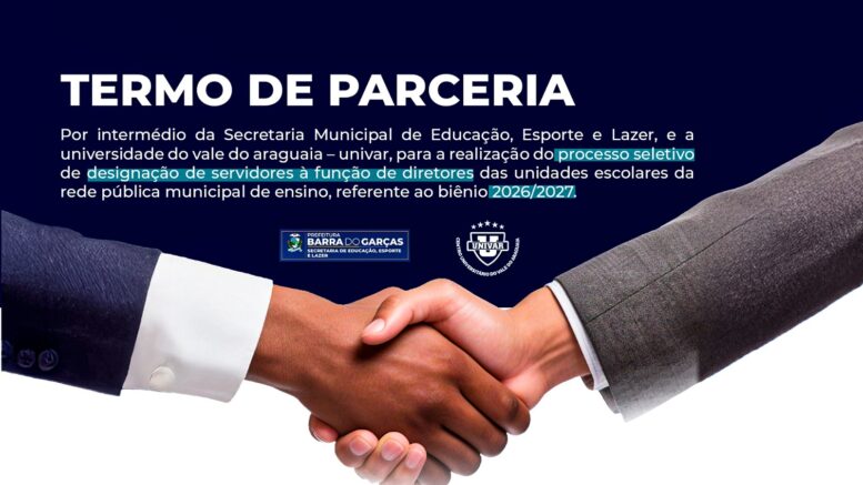 A Prefeitura de Barra do Garças, por meio da Secretaria Municipal de Educação, Esporte e Lazer, firmou o Termo de Parceria nº 001/2025 com o Centro Universitário do Vale do Araguaia (UNIVAR) para a realização do processo seletivo de designação de servidores à função de diretores das unidades escolares da Rede Pública Municipal de Ensino, referente ao biênio 2026/2027.