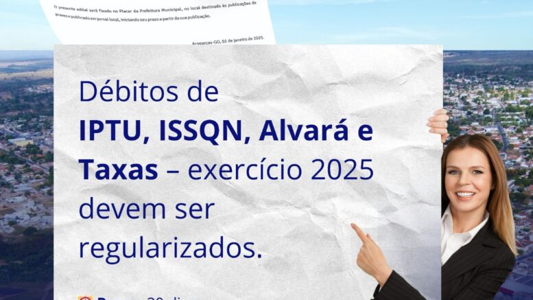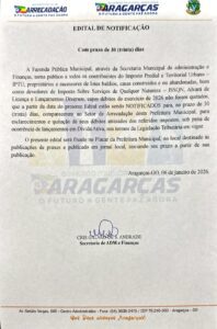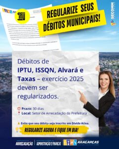 A Prefeitura Municipal de Aragarças, por meio da Secretaria Municipal de Administração e Finanças, informa que contribuintes com débitos municipais em aberto referentes ao ano de 2026 devem procurar o Setor de Arrecadação para regularizar sua situação.
