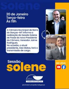 A sessão solene de transmissão de cargo será realizada no dia 20 de janeiro, assegurando a continuidade administrativa e legislativa da Câmara Municipal. Na mesma ocasião, ocorrerá a eleição suplementar para o cargo de vice-presidente, para o qual, até o momento, o nome do vereador Ronair Nunes desponta como favorito.