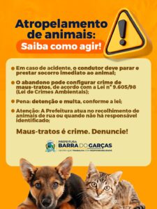 A Prefeitura de Barra do Garças reforça a orientação aos motoristas e pedestres sobre como proceder corretamente em casos de acidentes envolvendo animais nas vias públicas. O esclarecimento se faz necessário para informar a população sobre os deveres legais dos condutores e a área de atuação do poder público municipal.