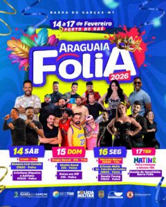 De 14 a 17 de fevereiro, a Prefeitura de Barra do Garças realizará o Carnaval Araguaia Folia, com atrações nacionais e regionais, no Porto do Baé. A programação inclui diversas atrações musicais, trio elétrico, participação especial dos blocos de rua e matinê para crianças e idosos.