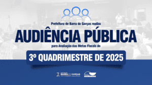 A Prefeitura de Barra do Garças, por meio da Secretaria Municipal de Planejamento e Finanças, irá realizar uma Audiência Pública de Demonstração e Avaliação do Cumprimento das Metas Fiscais, referente ao 3º Quadrimestre de 2025. A sessão acontecerá no dia 27 de fevereiro, às 10h, no plenário da Câmara de Vereadores.