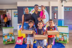 Para Naiara, mãe de uma criança matriculada na creche Esmeralda Gomes, receber o kit escolar com materiais básicos foi inesperado. “Eu tenho uma bebê aqui na creche, de 1 ano e 8 meses, e fiquei muito feliz em receber o kit específico para a faixa etária dela”.